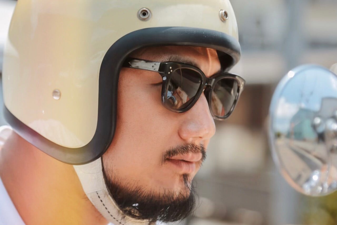 テンプルからモダン(耳にかかる部分)のラインはヘルメットの装着を想定しており、ジェット/フルフェイス・ヘルメットの使用時にも干渉せずストレスはありません。