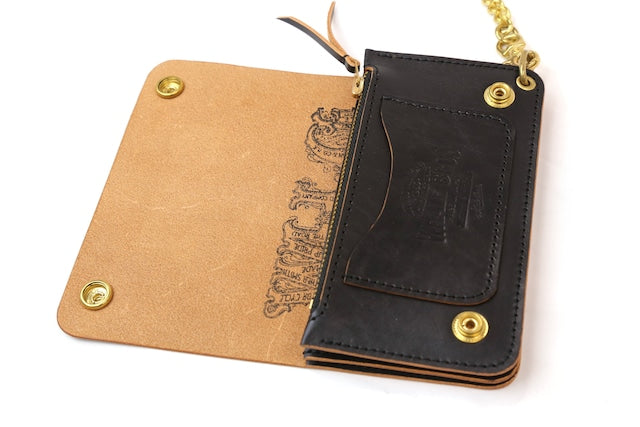 また財布と同じレザーを使用したカードケースを付属し、トラッカーウォレットの悩みの種となっているカードが綺麗に収納できて安心です。