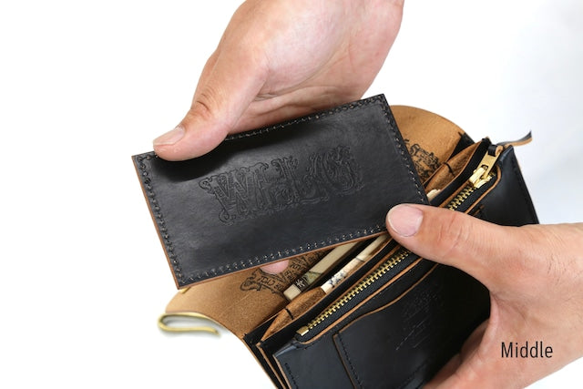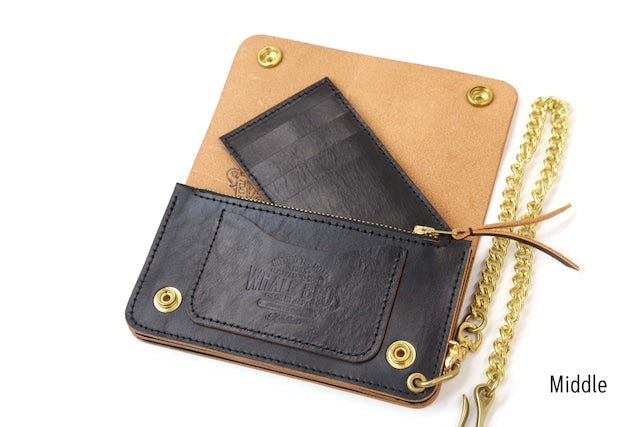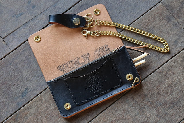 また財布と同じレザーを使用したカードケースも付属し、トラッカーウォレットの悩みの種となっているカードも綺麗に収納できて安心です。